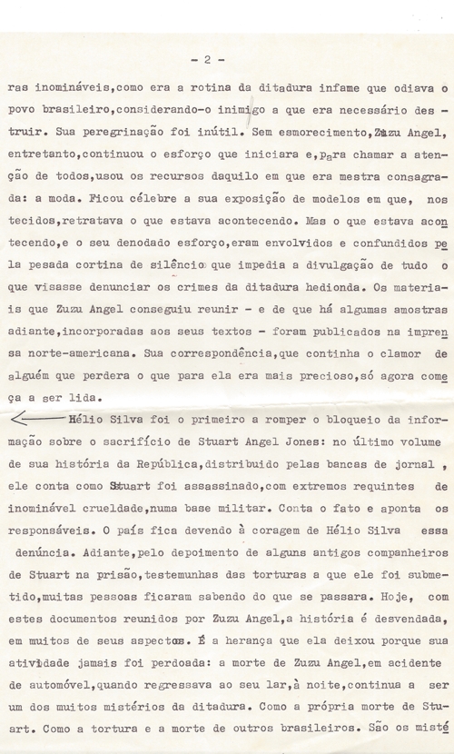 Carta entregue por Zuzu ao secretário de Estado americano Henry Kissinger (juntamente com um dossiê sobre a morte de Stuart)+, por ocasião de sua vinda ao Brasil, em fevereiro de 1976. Dois meses e duas semanas depois, Zuleika Angel Jones, a Zuzu Angel, foi assassinada pelas mesmas forças que executaram o seu tão amado filho.